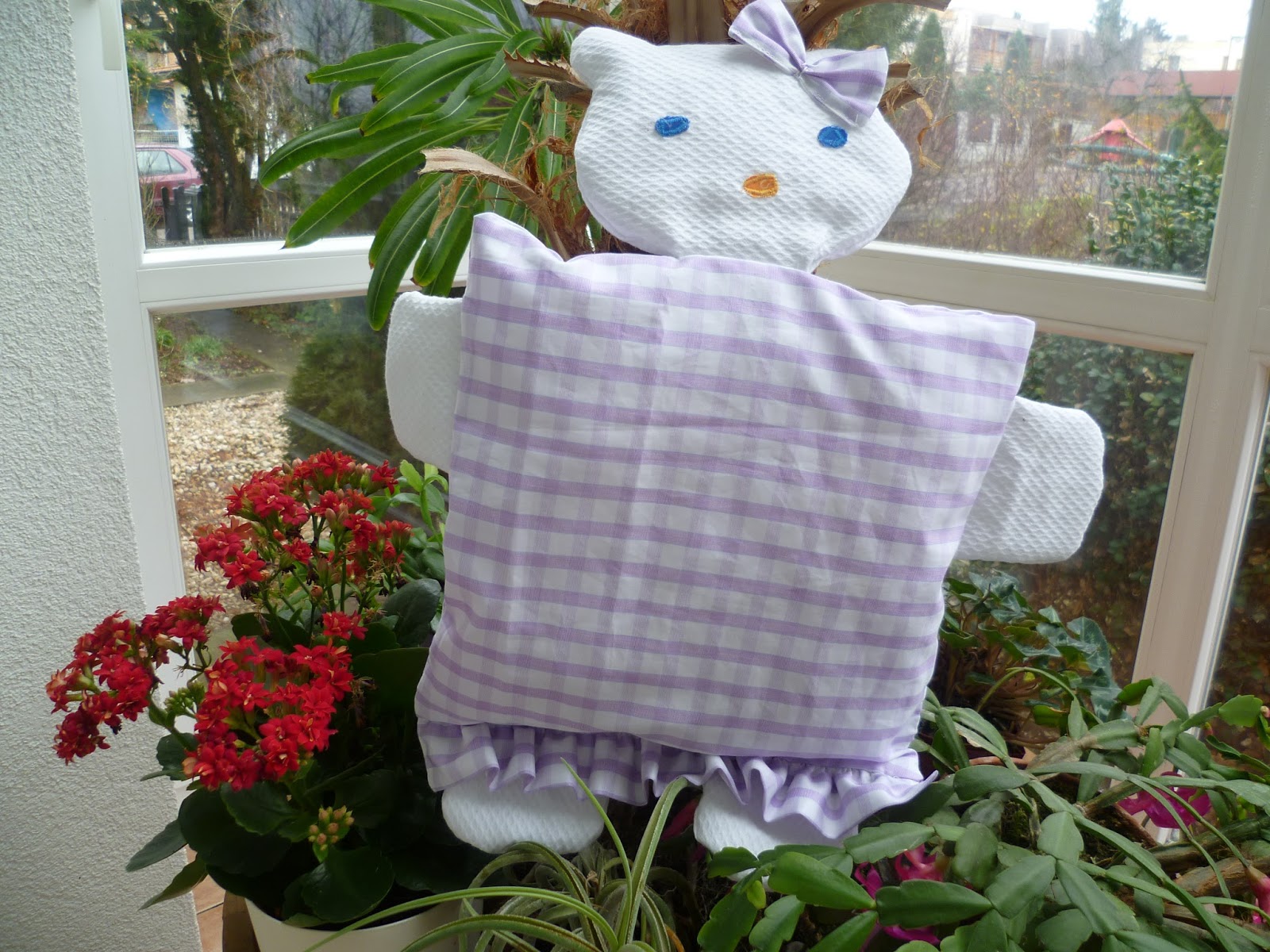 Naše malá vnučka Alička má teď kočičí Kitty období. Ve věku 20ti měsíců tomu říká mňau mňau a chce mít na všem obrázek Hello Kitty. Ušila jsem jí usínací polštářek - rozměr čtverce 25 x2 5 cm, výška kočky je 43 cm. Doplní v postýlce zajíčka, toho jsem šila - obrázek tu a další kočičí polštář - obrázek je tady