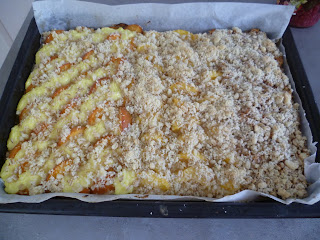 Na koláč jsem dala tři náplně.Meruňky s tvarohem,broskve a jablíčka se skořicí.